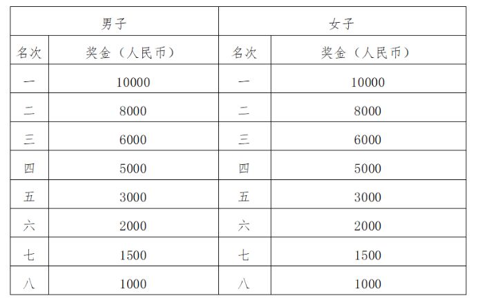 (四)奖金按达到的比赛成绩要求对应发放。所有获奖选手的成绩在赛事官方平台公示10日并确认无问题后再行发放。获奖选手收到组委会电话通知后,请上传本人有效身份证明至组委会邮箱办理相关手续,如果发现检测有问题者,取消该名次和奖金,后面名次不递补。